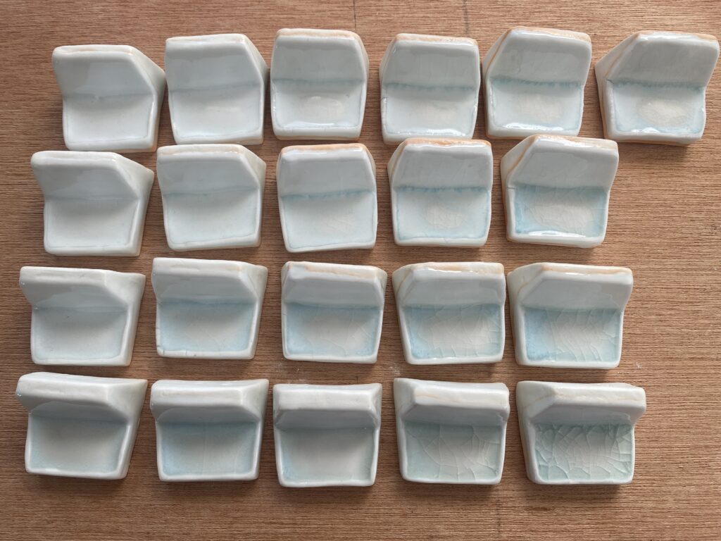 2025年は21種3パターン、63個のテストピースを焼成、小物に施釉するも熱膨張係数が合っていないようで、貫入が入ってしまいました。