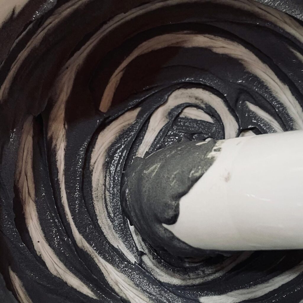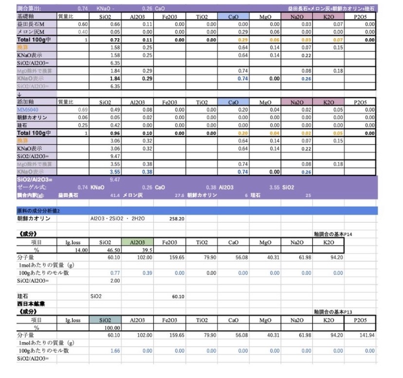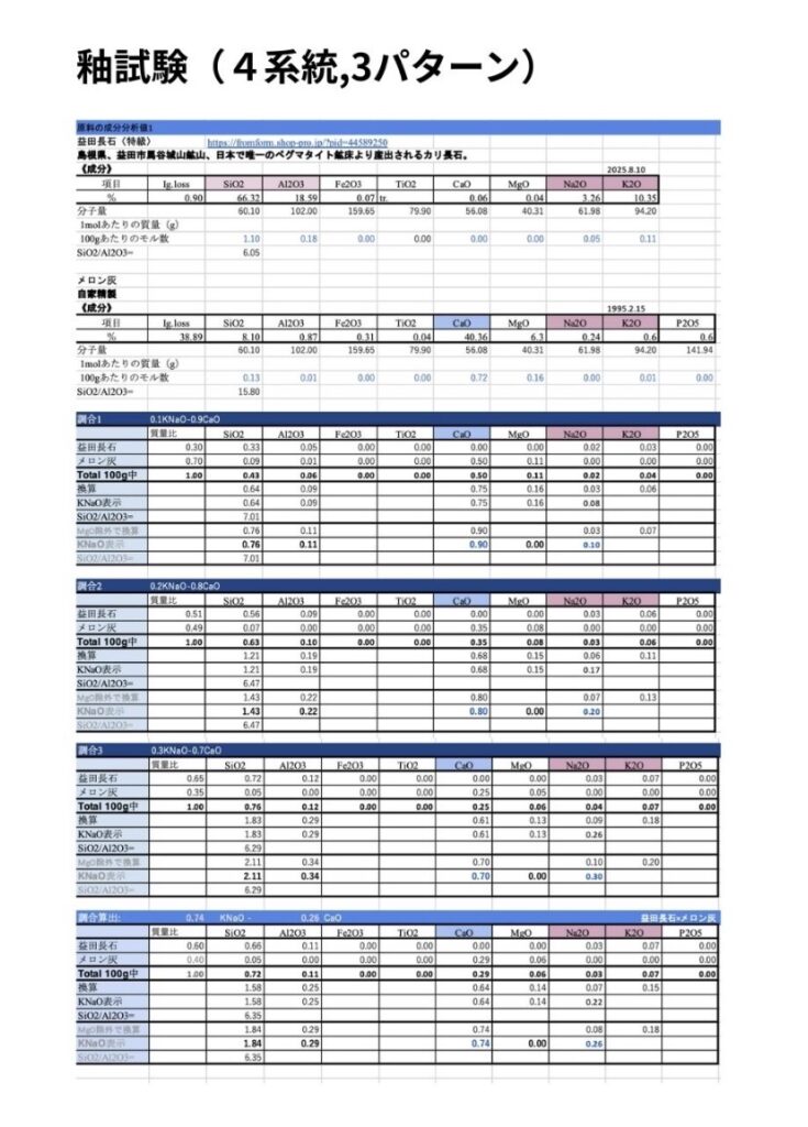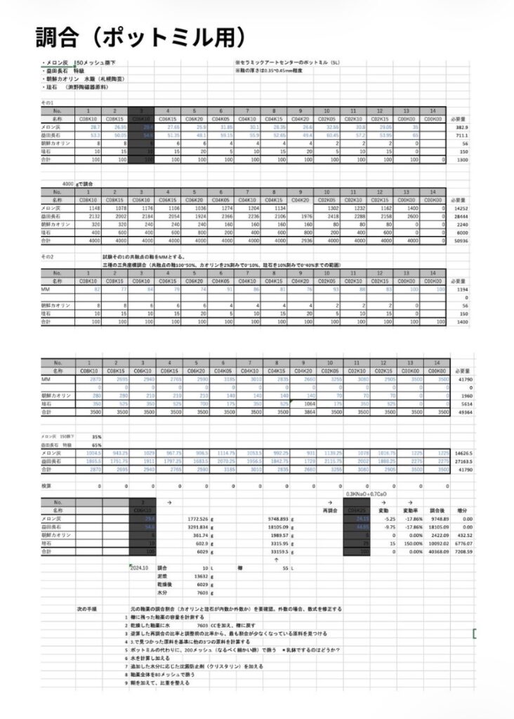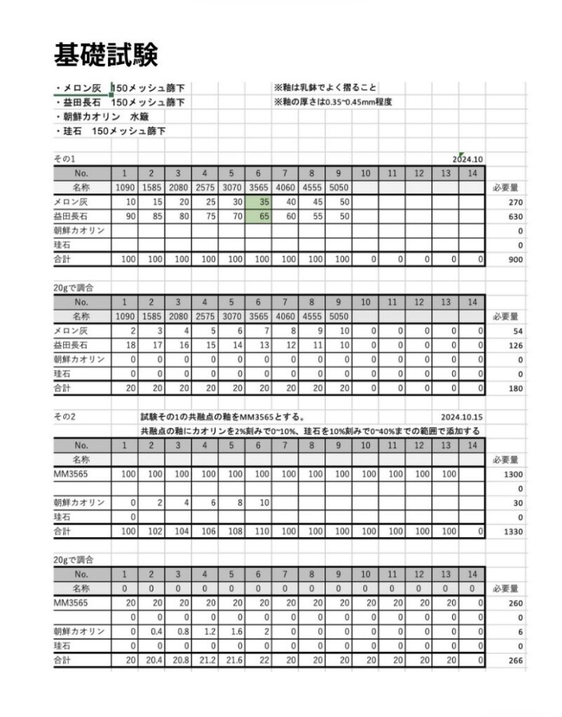 2024年夏から始めたメロン灰青白磁の調合試験。